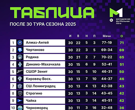 Два победителя - "Алмаз-Антей" (Санкт-Петербург) и ""Чертаново" (Москва) - перешли в МФЛ-А, им на смену придут калининградская "Балтика" и грозненский "Ахмат". Аутсайдеры - волгоградский "Ротор" и подольский "Витязь" - согласно регламенту покидают лигу. Команды, занявшие 3-е и 4-е места - "Родина" (Москва) и "Динамо-Махачкала" проведут стыковые встречи с командами "Сочи" и "Крылья Советов" (Самара), занявшими 13-е и 14-е места в МФЛ-А.